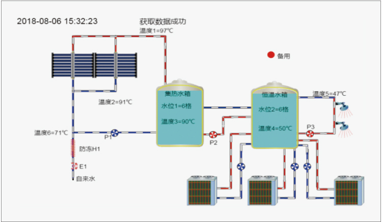 在線監測:實時云圖窗口中為系統的運行示意圖,圖中可以看到系統的動態運行情況,包括各處的溫度值、水箱水位、水泵、電磁閥等設備是否開啟等??梢钥吹剿鲃?、水泵的轉動等動畫。